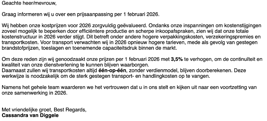 Helaas hebben wij, kort na de prijsaanpassing per 1 januari 2026, opnieuw bericht ontvangen van onze producent dat de productiekosten vanaf februari 2026 verder zullen stijgen.
